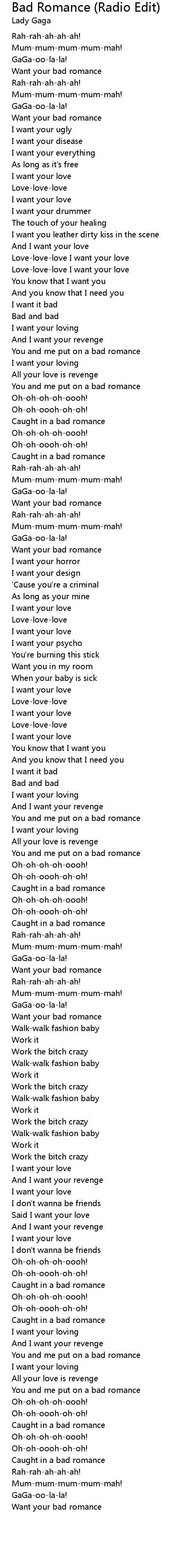 Your Bad Romance Lyrics Clean pix are geared up in this blog. Bad Romance Lyrics Clean are a topic that is being searched for and appreciated by netizens these days. You can Download the Bad Romance Lyrics Clean here. Save all royalty-free images.